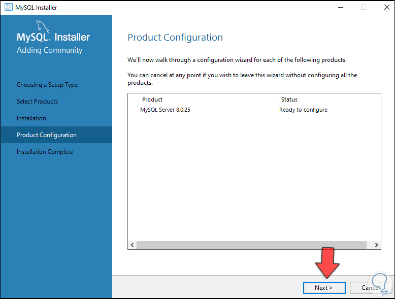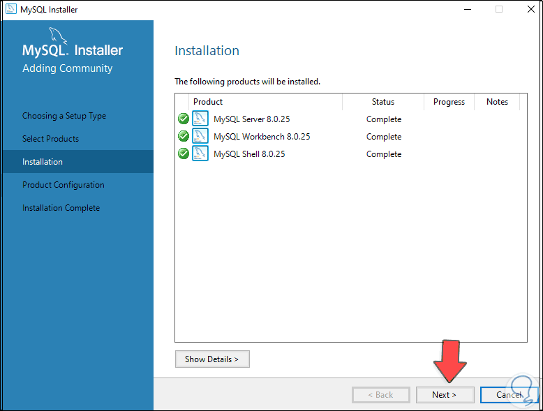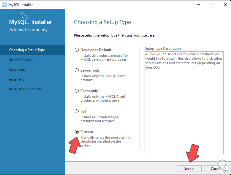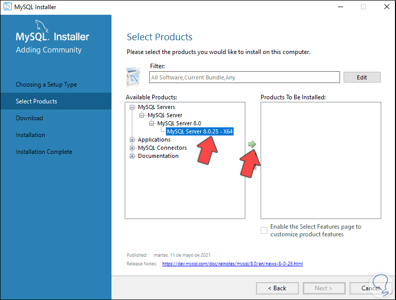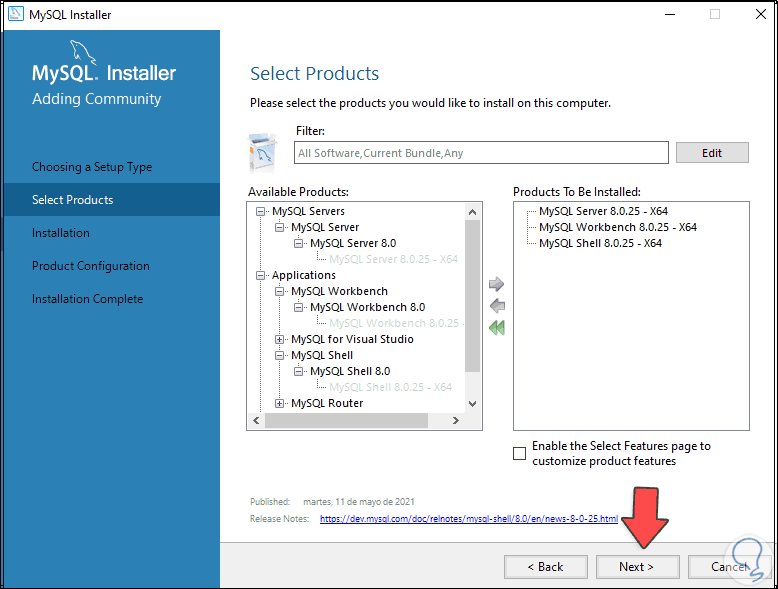 Damos clic en Next y vamos a añadir los paquetes deseados de MySQL, para esto seleccionamos el paquete: