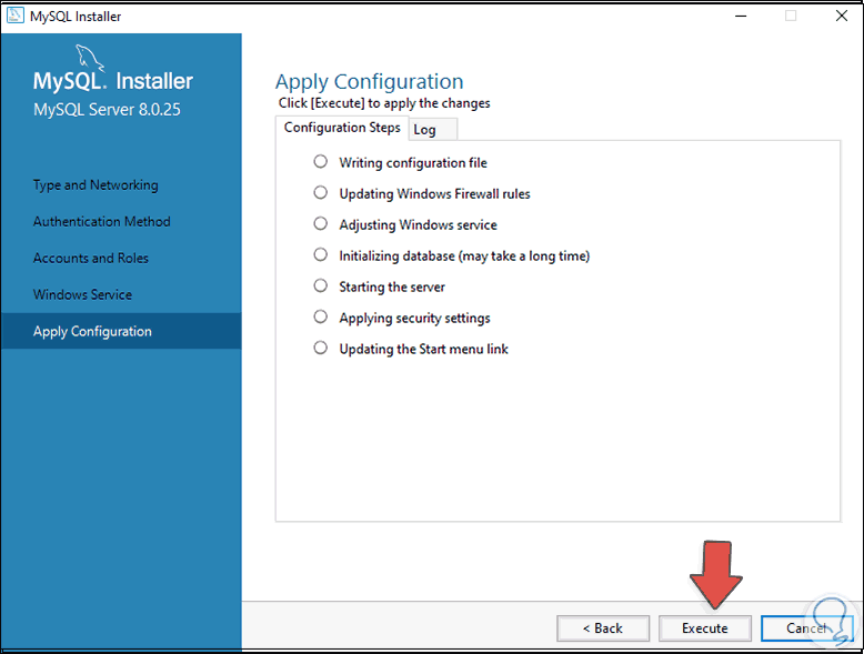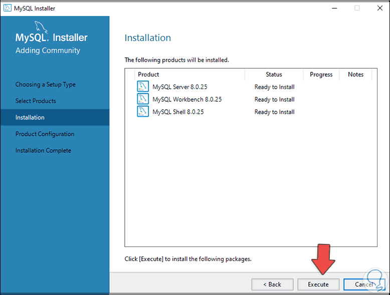Damos clic en "Execute" para completar el proceso de instalación de MySQL en Windows 10:
