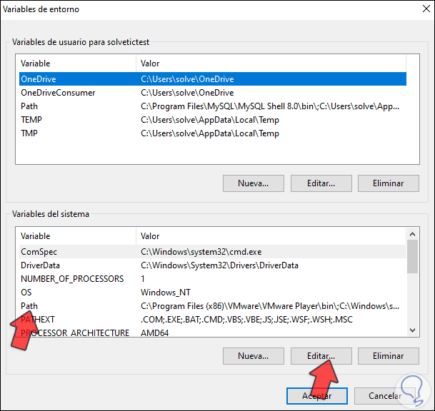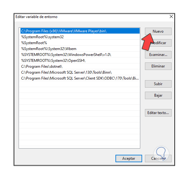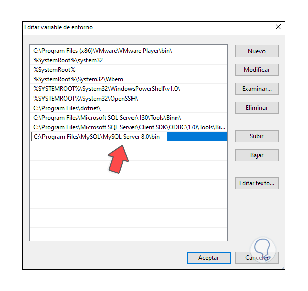 Damos clic en "Nuevo" y pegamos la ruta de MySQL. Aplicamos los cambios y cerramos las ventanas.