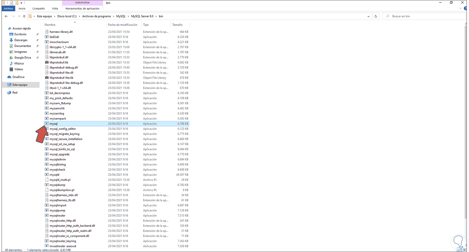 Abrimos el Explorador de archivos y vamos a la ruta donde se ha instalado MySQL: