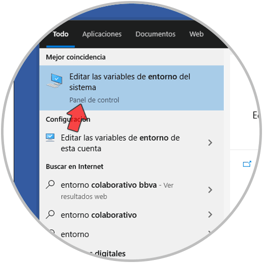 Es necesario que esta ruta (donde está el ejecutable de MySQL), este en las variables del sistema, para esto en el buscador de inicio ingresamos "entorno":