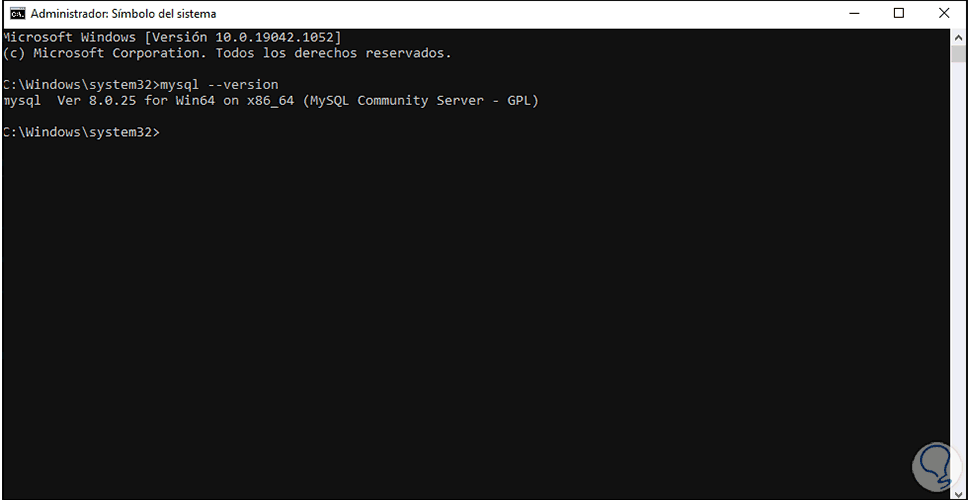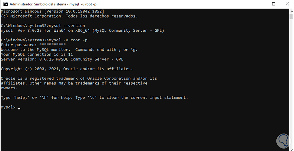 Ingresamos la contraseña creada en la configuración y tendremos acceso a MySQL en Windows 10: