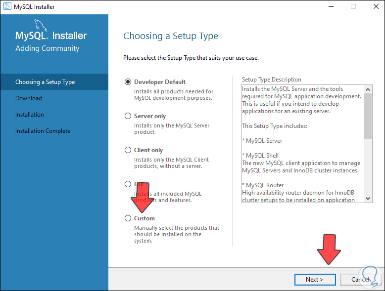 Activamos la casilla "Custom" para personalizar la instalación: