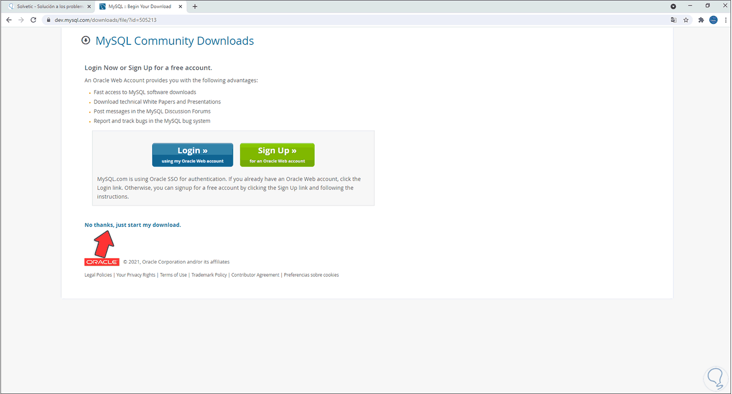 Damos clic en “No thanks, just start my download” para iniciar la descarga de MySQL, validamos la descarga: