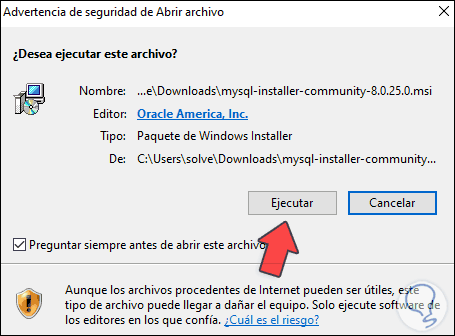 Ejecutamos el instalador de MySQL en Windows 10 y será necesario confirmar la operación: