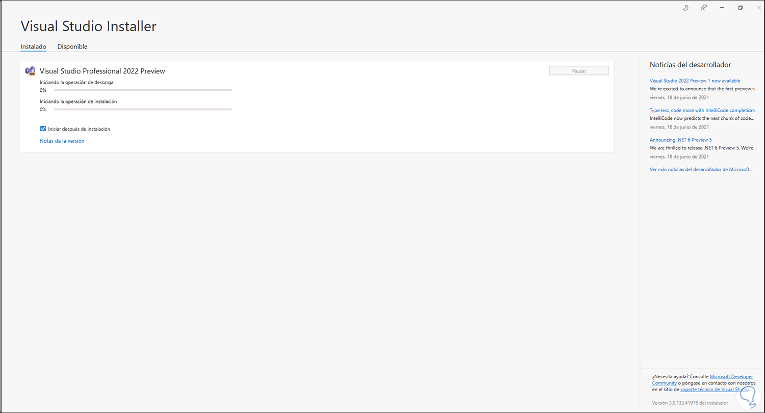 De forma automática será abierto el asistente de instalación de Visual Studio 2022 Preview: