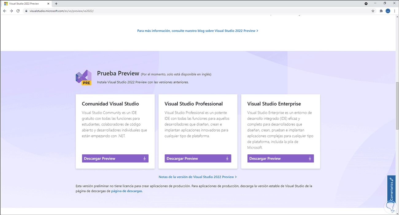 Lo primera será ir a la URL de Visual Studio 2022 Preview en el siguiente enlace: