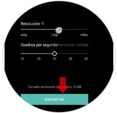 Elige las opciones de exportación, pulsa en "Exportar" y tu vídeo se guardará en la galería.