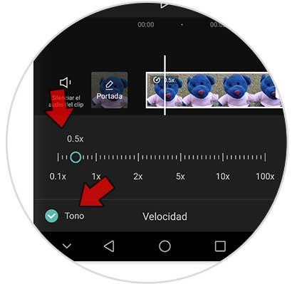 Para ralentizar la velocidad desplaza el cursor hacia la izquierda. Puedes ver que también puedes activar el "Tono" para que aplique la velocidad.