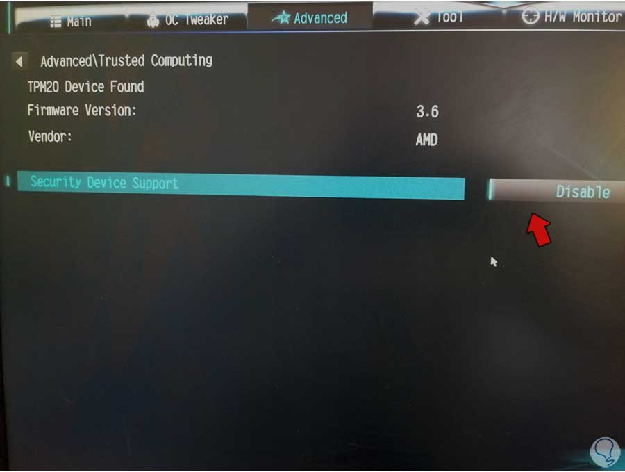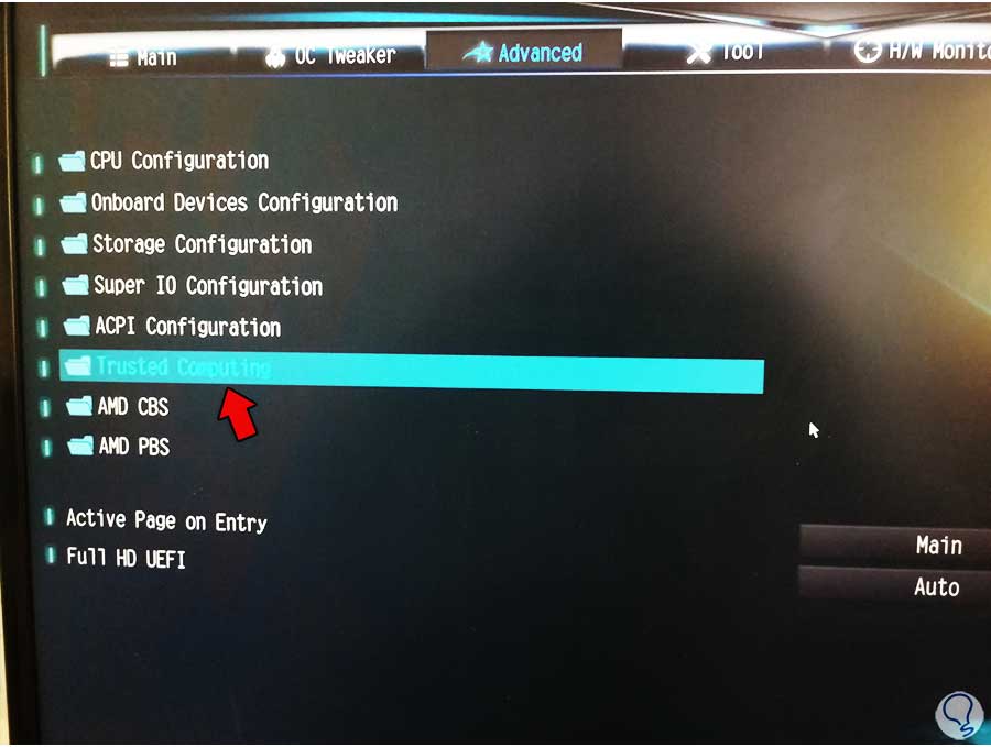 En el caso de AMD, iremos a la pestaña "Advanced" y luego vamos a "Trusted Computing":