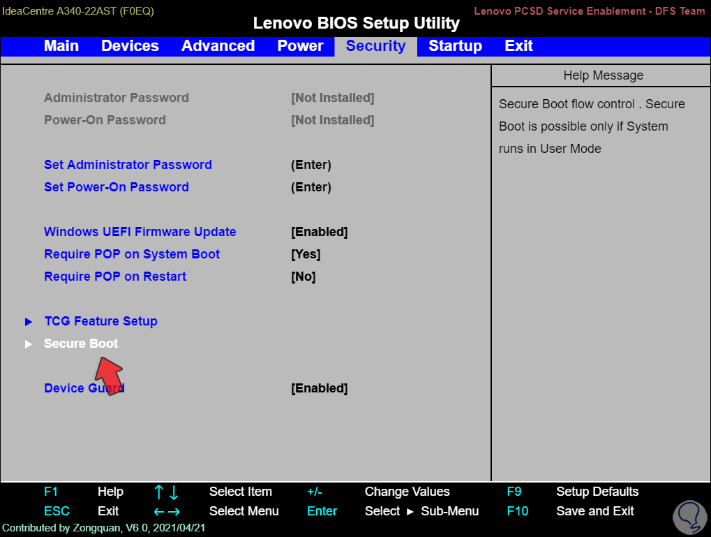 Pulsamos una de las teclas del fabricante para acceder como Supr, Del, F2, F11, etc, en el caso de Intel debemos ir a la pestaña "Security":