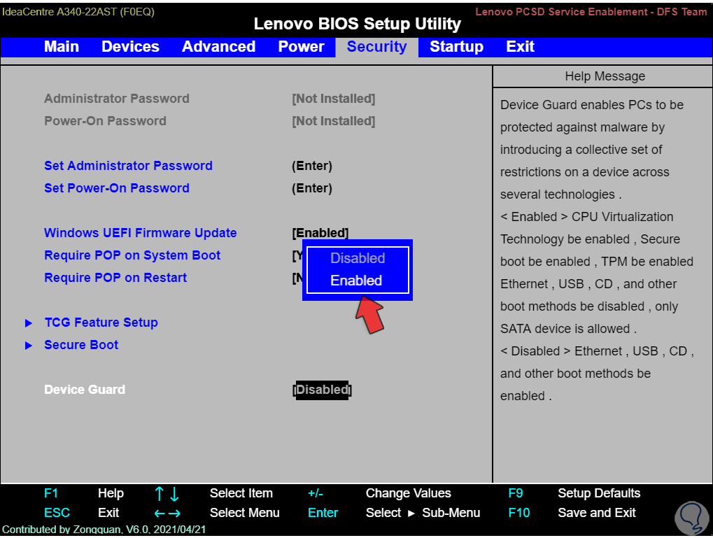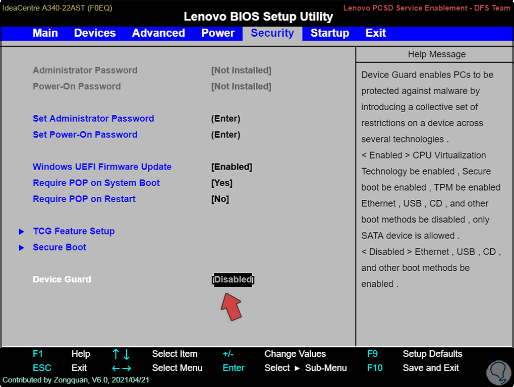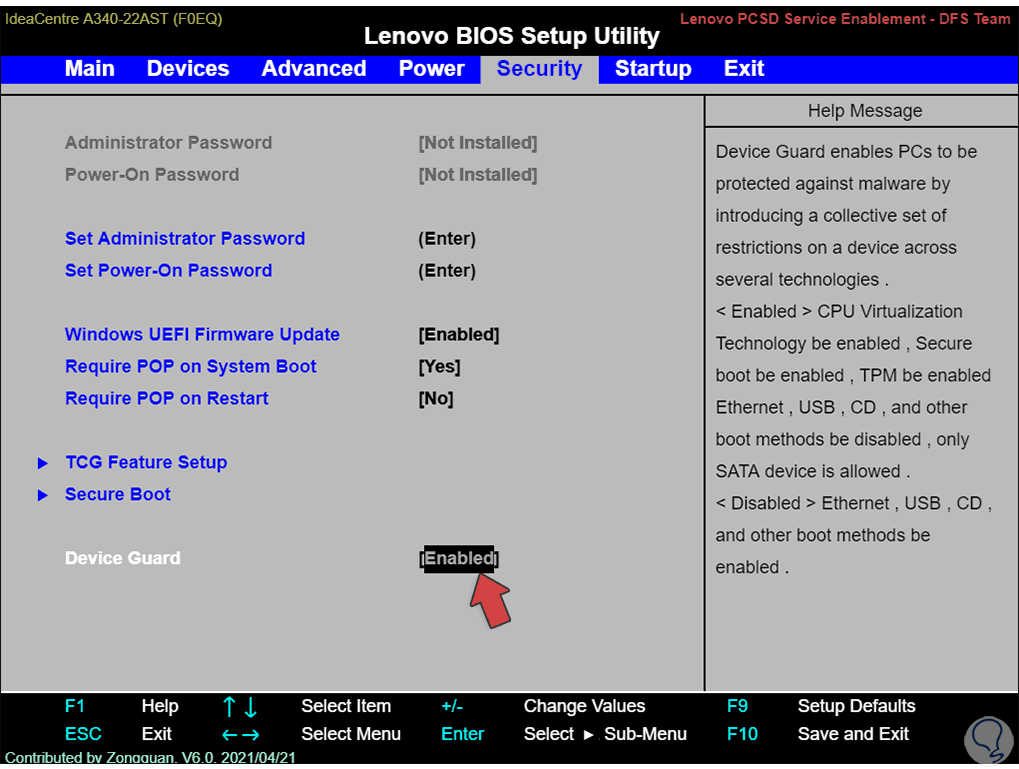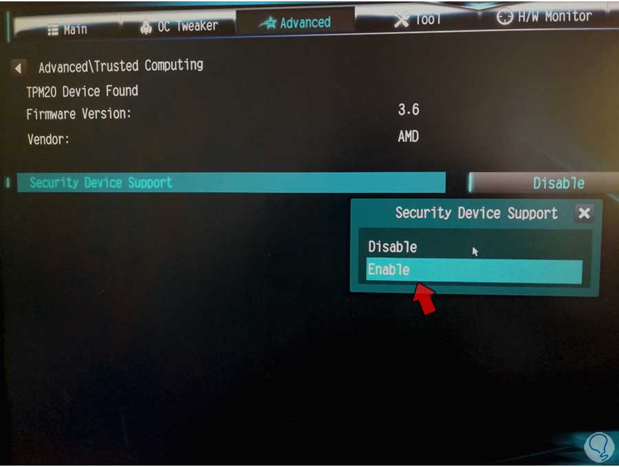 Secure Boot o arranque seguro es otro de los requisitos de Windows 11 y este arranque seguro es propio de UEFI y su tarea es impedir la ejecución de software no firmado o certificado en el arranque del sistema que pueda ocasionar daños. Ahora habilitamos TPM, vamos a la línea "Device Guard":