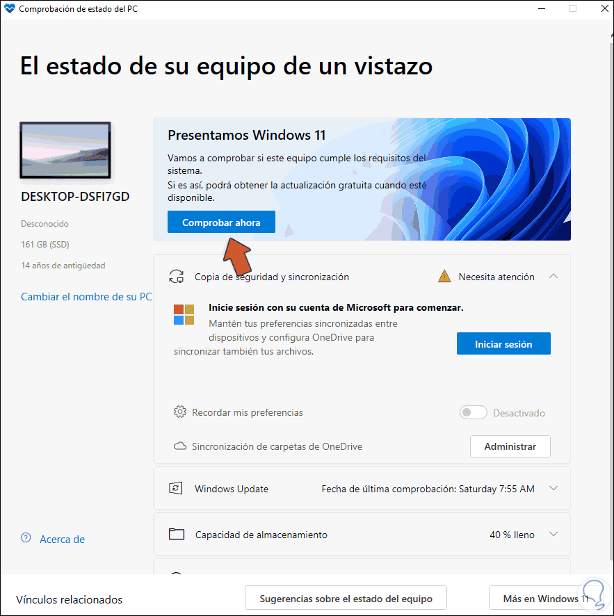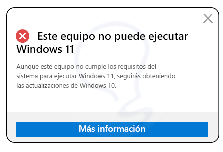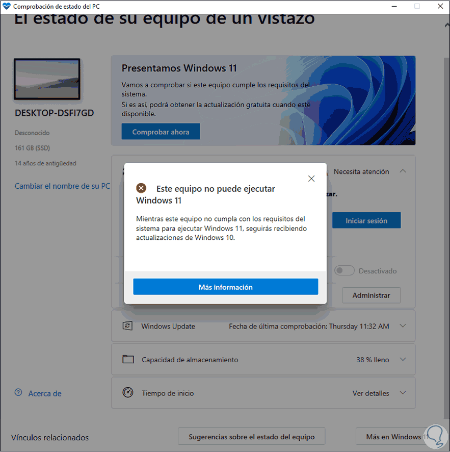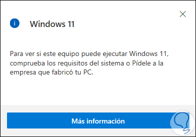 Allí damos clic en "Comprobar ahora" para ver si tu sistema es o no compatible con Windows 11, existen algunas opciones en el caso de que no sea posible y no podamos ejecutar Windows 11, ver el siguiente mensaje: