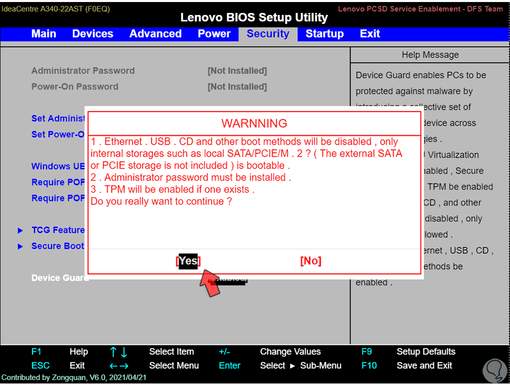 Asignamos el valor "Enabled" para activar el TPM y veremos el siguiente mensaje: