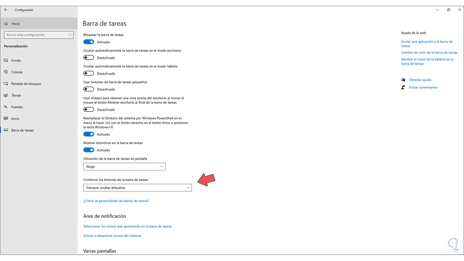 En el campo "Combinar los botones de la barra de tareas" desplegamos sus opciones: