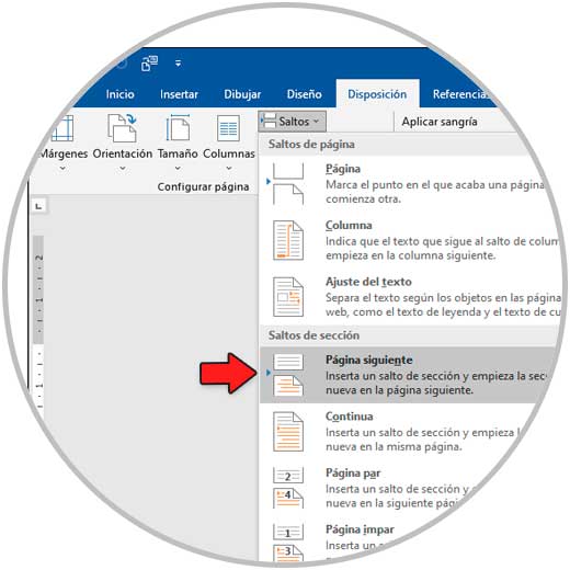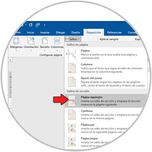 Vamos al menú "Disposición", ubicamos el cursor en el párrafo que estará en posición horizontal y luego en el grupo “Configurar página” damos clic en "Saltos" y seleccionamos la opción "Página siguiente":