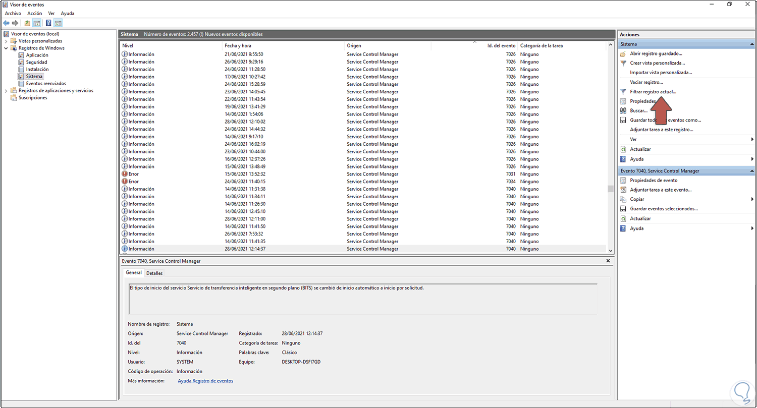 Una vez organicemos los ID de cada evento, damos clic en "Filtrar registro actual":