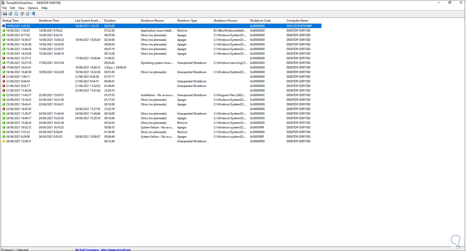 Ejecutamos el aplicativo para tener un resumen completo de los inicios de sesión y apagados de Windows 10: