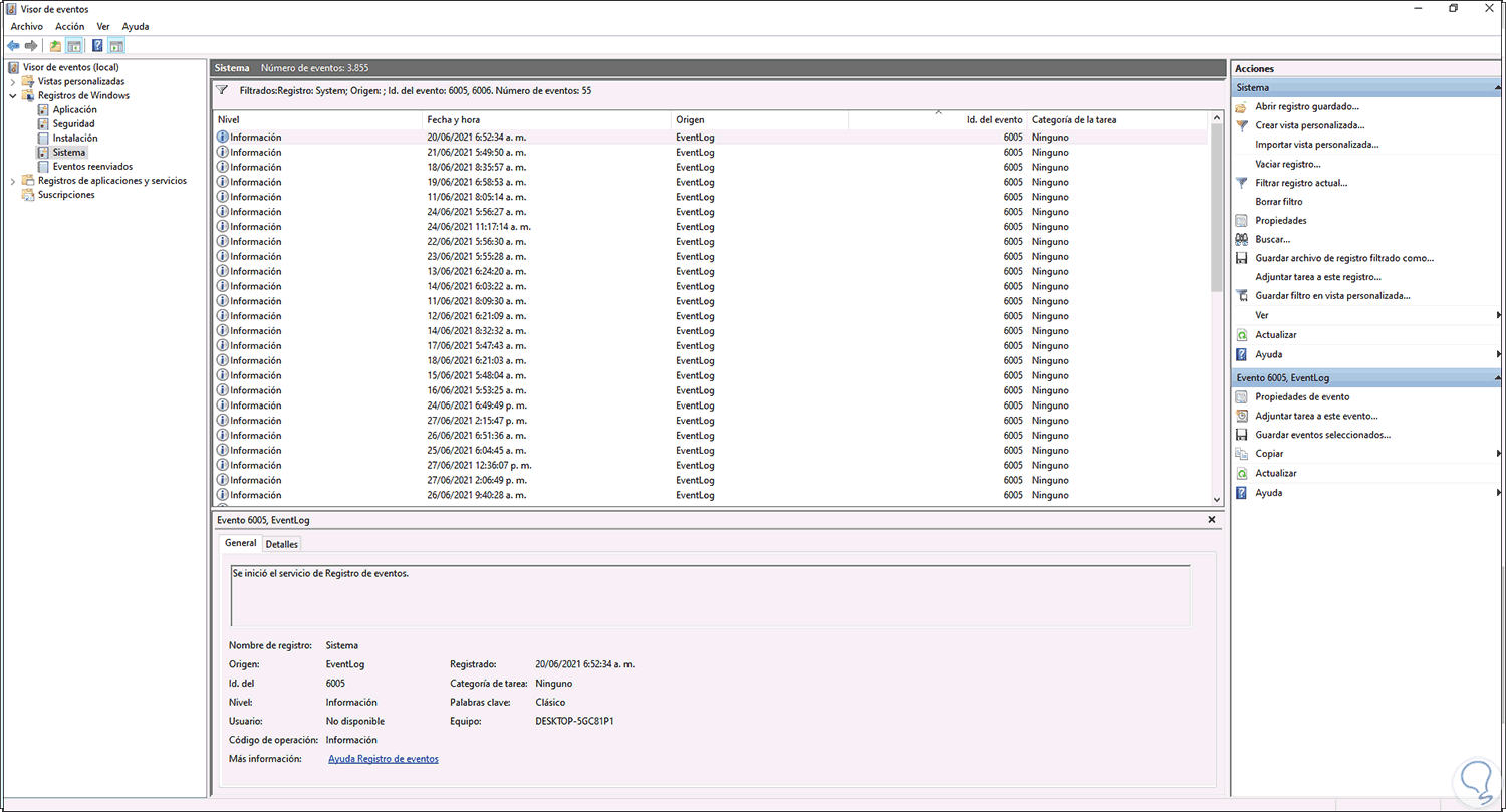 Veremos los ID de apagados e inicios de sesión allí disponibles en el visor de eventos: