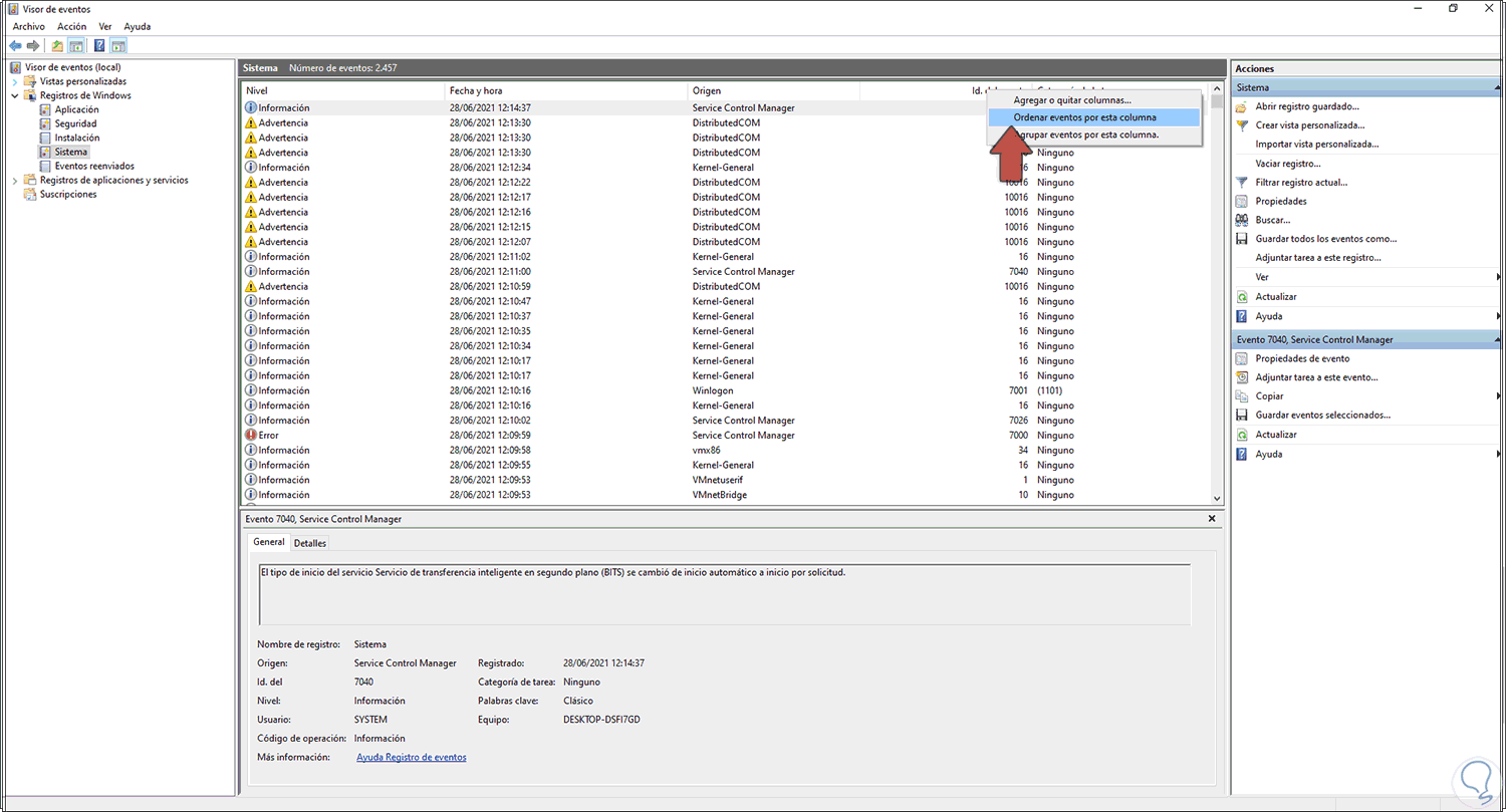 Ahora damos clic derecho sobre la columna "Id. del evento", seleccionamos la opción "Ordenar eventos por esta columna":