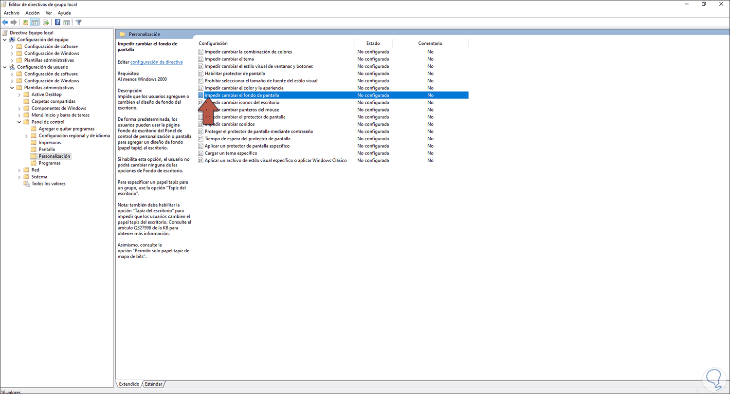 Como resultado de la política, estará bloqueada la opción de cambiar el fondo de escritorio en Windows 10: