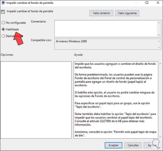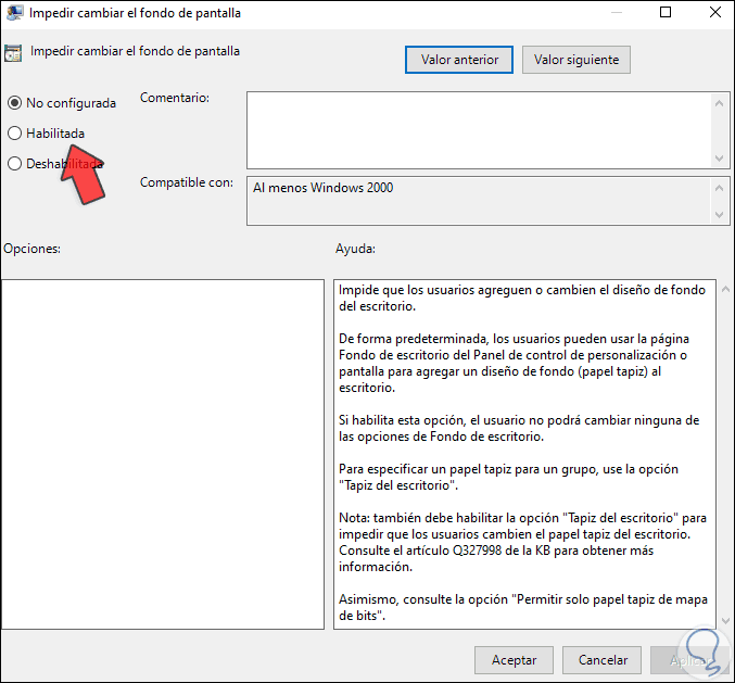 Damos doble clic en la política "Impedir cambiar el fondo de pantalla" y será desplegado lo siguiente: