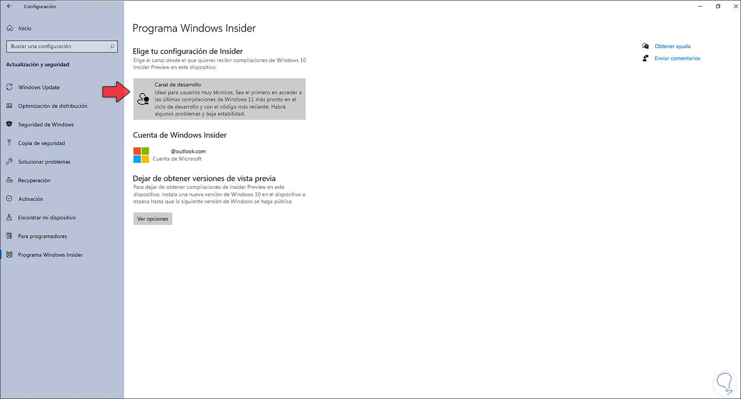 Luego vamos a "Actualización y seguridad - Programa Windows Insider". Allí confirmamos que el canal seleccionado sea Desarrollo y que el equipo puede recibir las actualizaciones de Windows 11, en caso de no serlo debemos revisar los requisitos de hardware.