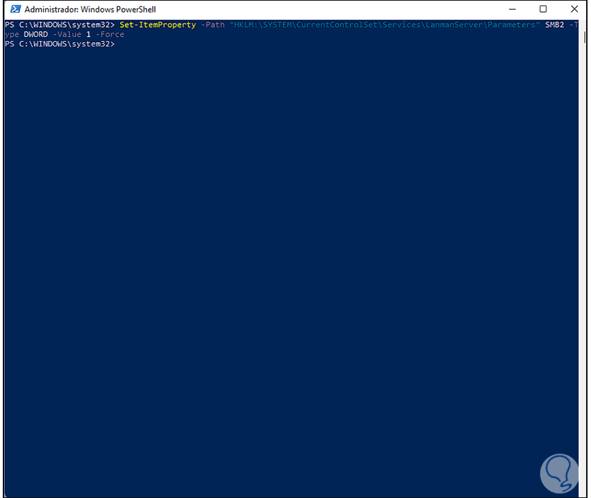 Después de esto, habilitamos SMB2 con el cmdlet: