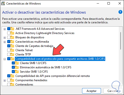 Desactivamos la casilla "Compatibilidad con el protocolo para compartir archivos SMB 1.0/CIFS":