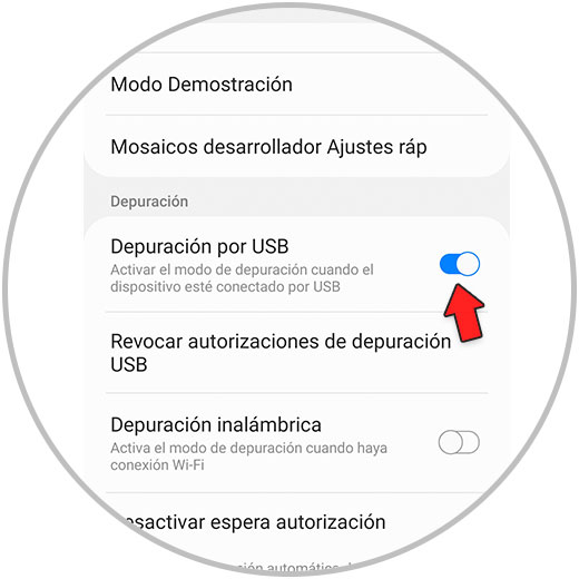 Desliza hasta el apartado de “Depuración USB” y activa la pestaña.