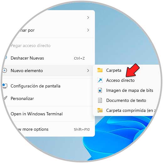 Es posible crear un acceso directo para abrir estas opciones con un solo clic, damos clic derecho en el escritorio y seleccionamos "Nuevo elemento - Acceso directo":