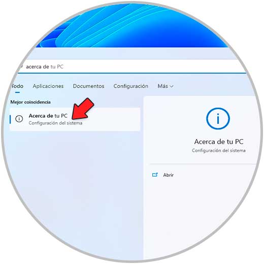 Acerca de es la base de las propiedades del sistema y equipo en Windows 11, en el buscador de inicio ingresamos "Acerca de":