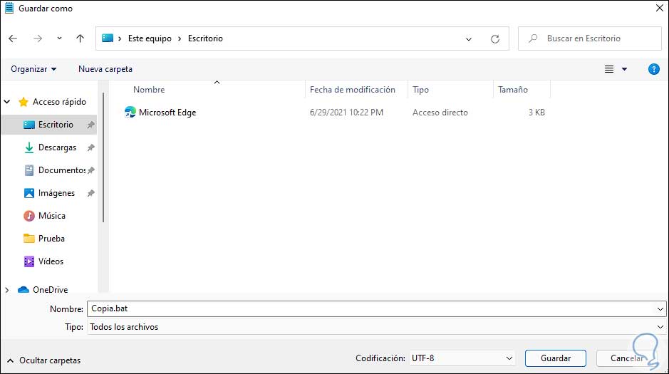 Guarda el archivo agregando al final .bat y en el campo "Tipo" seleccionamos "Todos los archivos":
