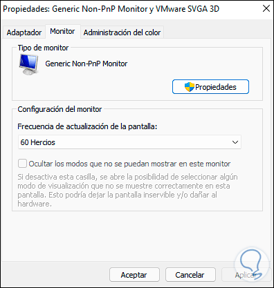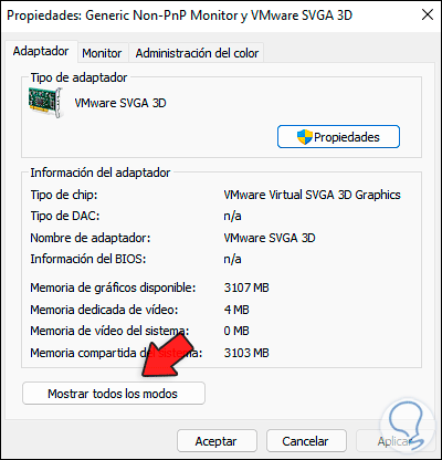 Allí damos clic en "Mostrar las propiedades de adaptador de pantalla" y se abrirá la siguiente ventana emergente: