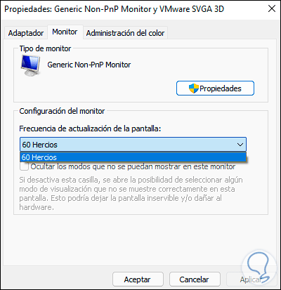 En la pestaña "Monitor" establece la frecuencia en el campo "Frecuencia de actualización de la pantalla":