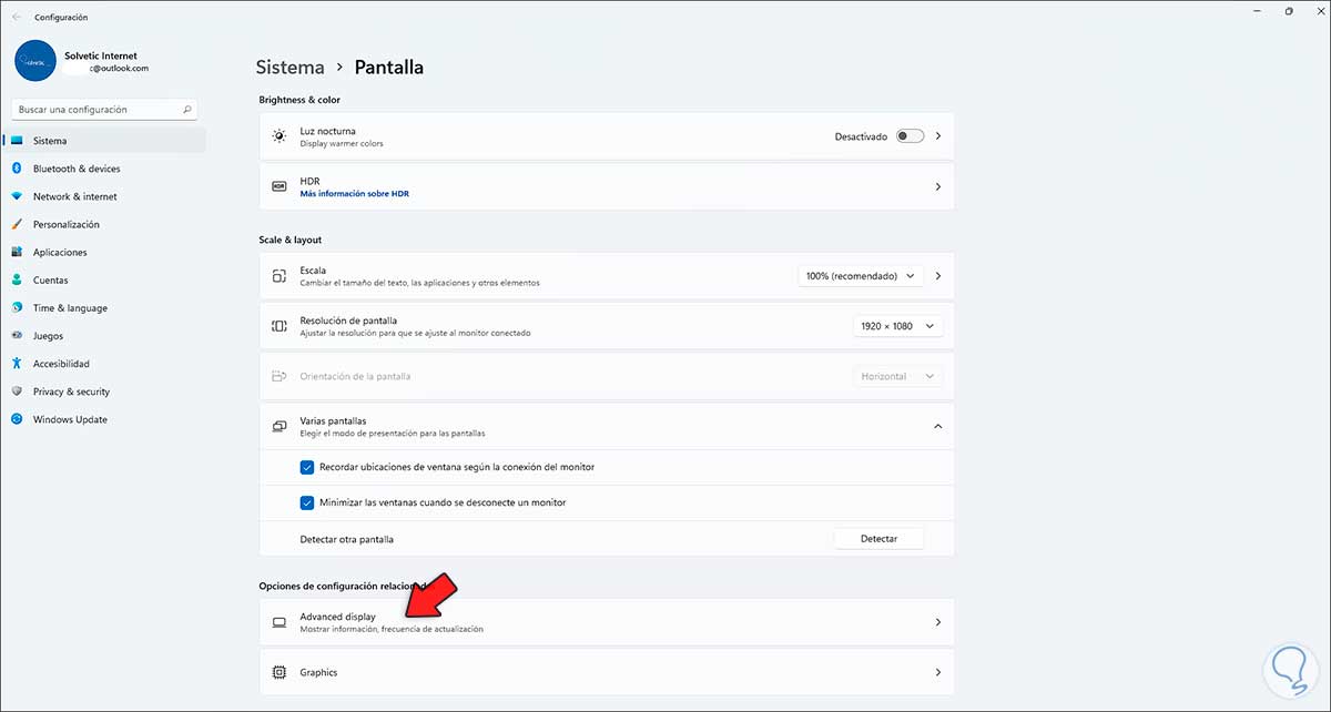 Se abrirá la siguiente ventana. Damos clic en "Advanced display" y luego veremos lo siguiente: