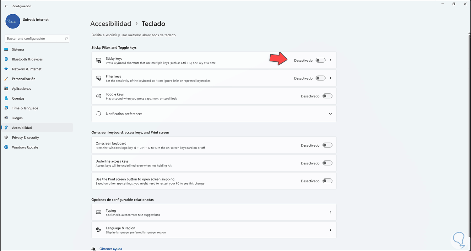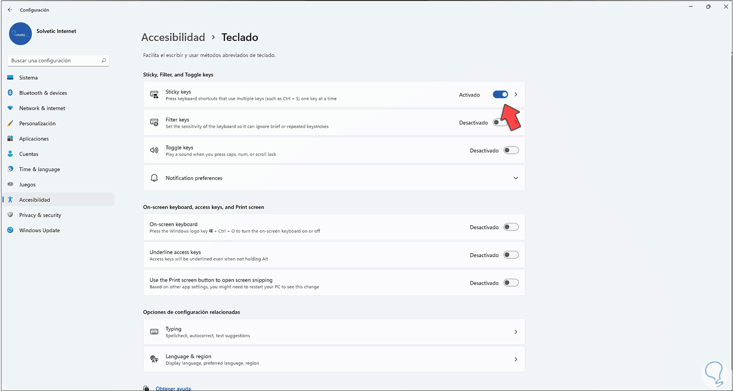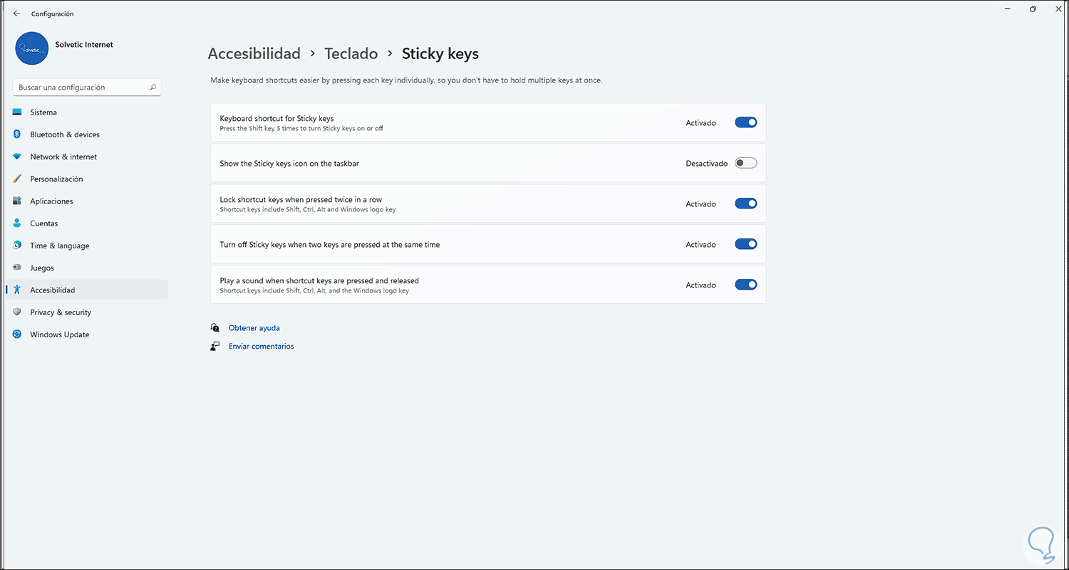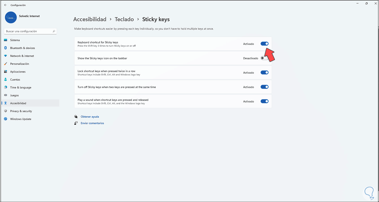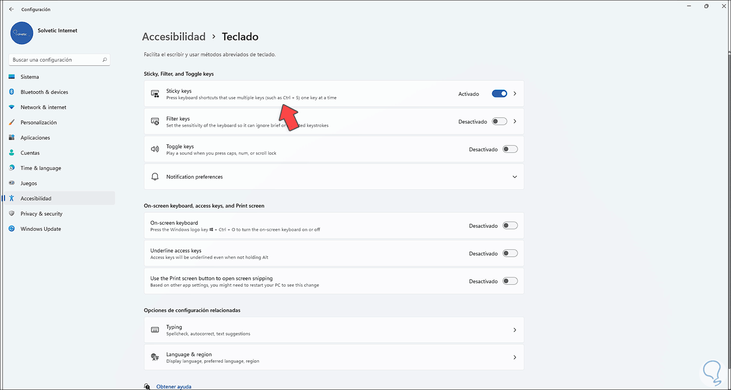 Ubicamos la línea “Sticky Keys"”, Windows 11 aun despliega algunos menús en inglés, activamos el interruptor Sticky keys para activar las Teclas especiales: