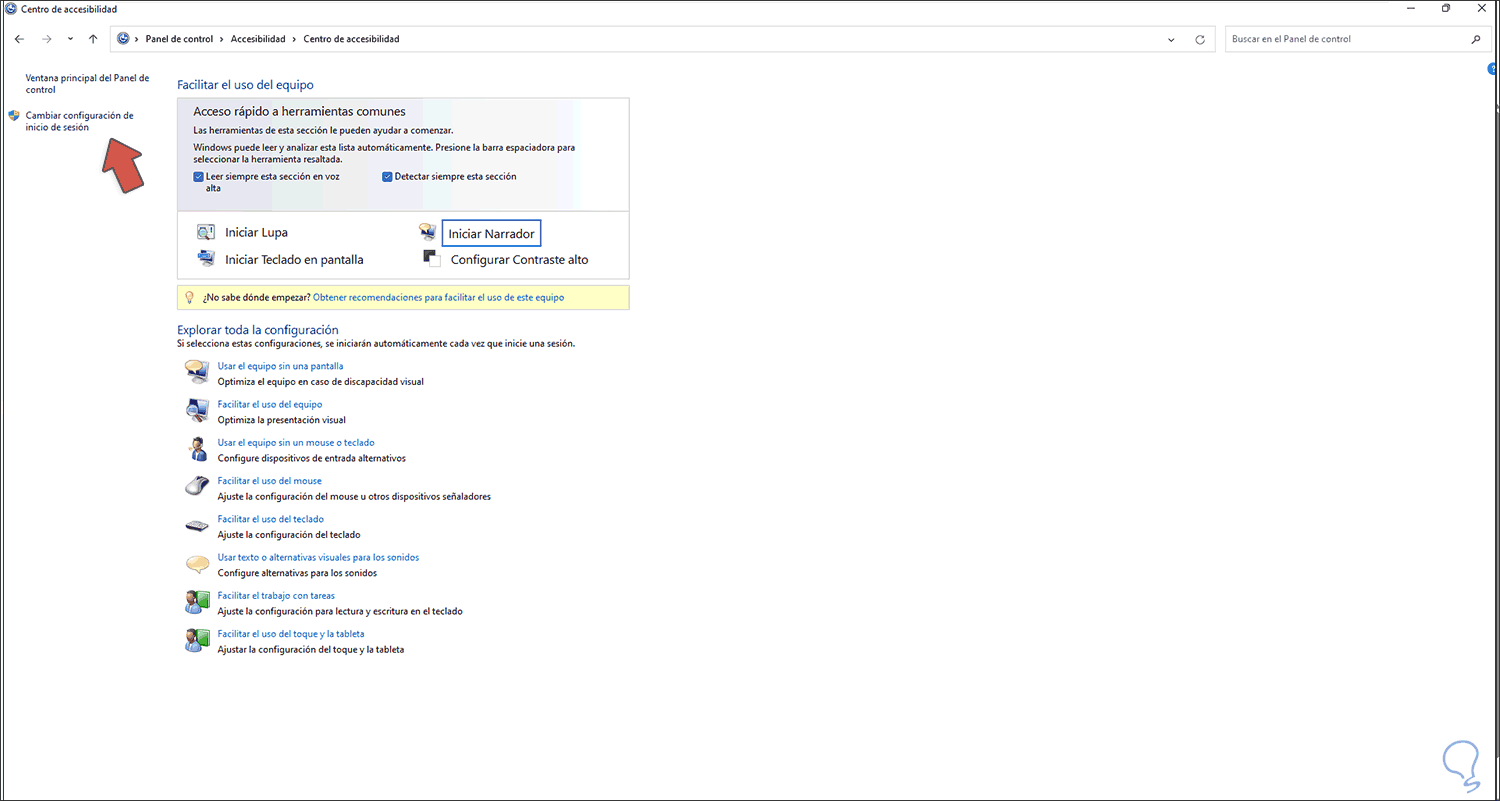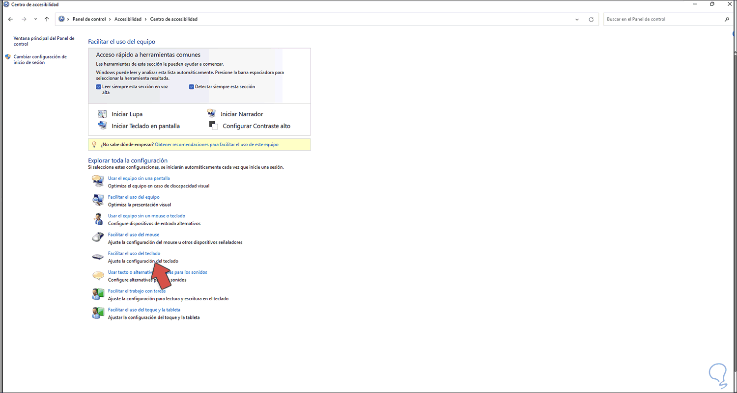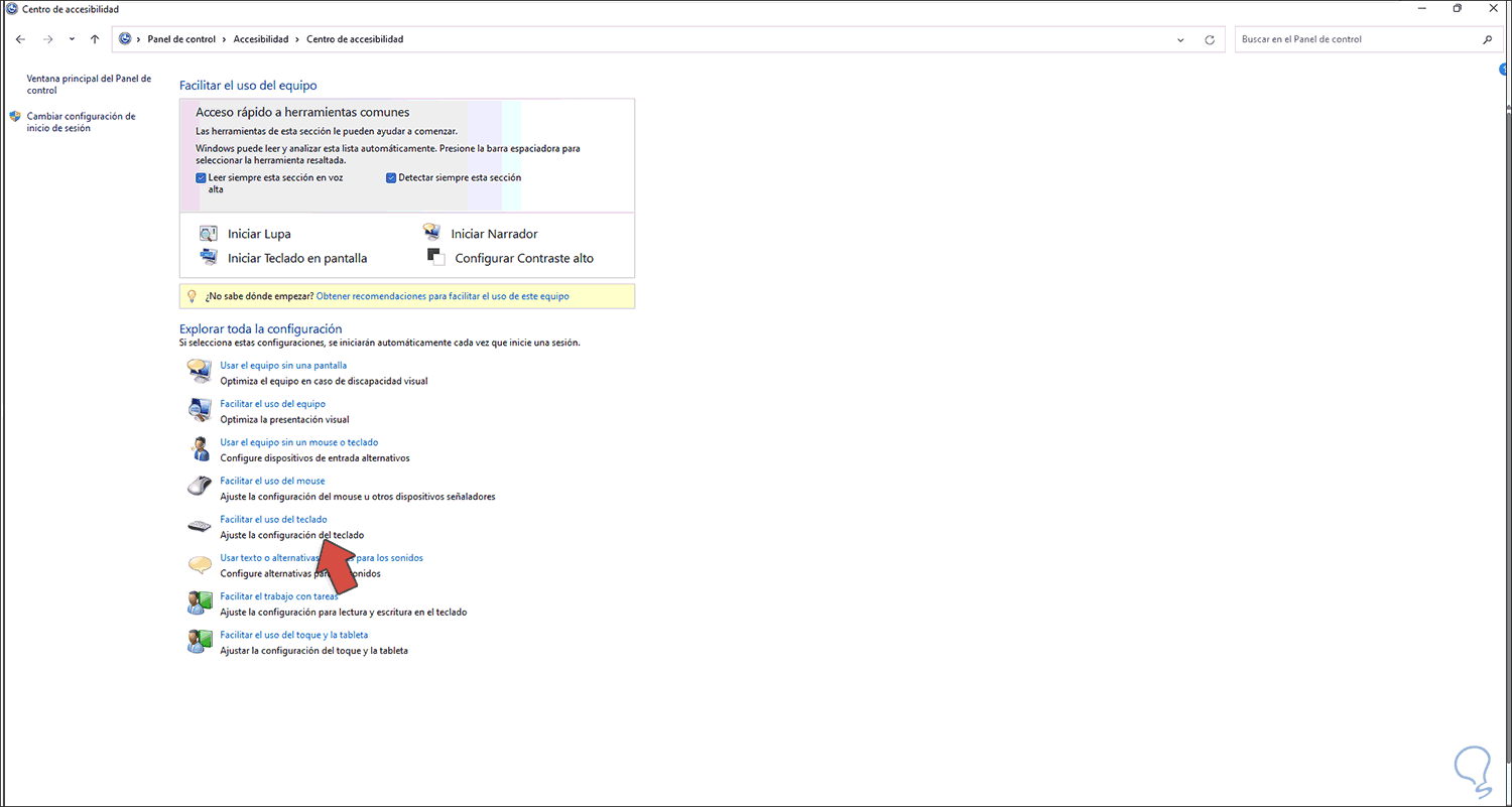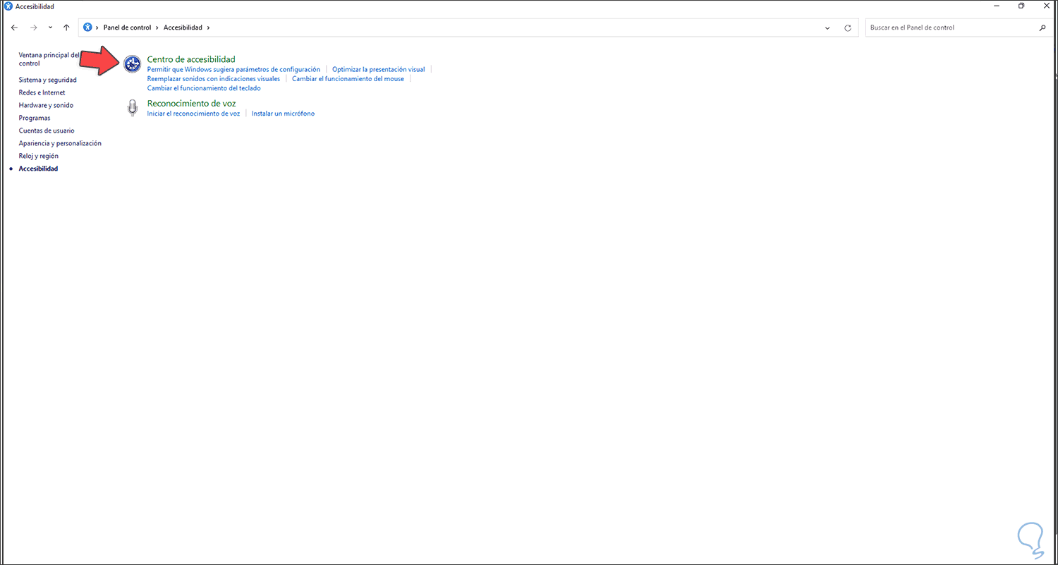 Opcionalmente podemos acceder el Panel de control e ir a la ruta "Accesibilidad - Centro de accesibilidad", al abrirlo veremos lo siguiente: