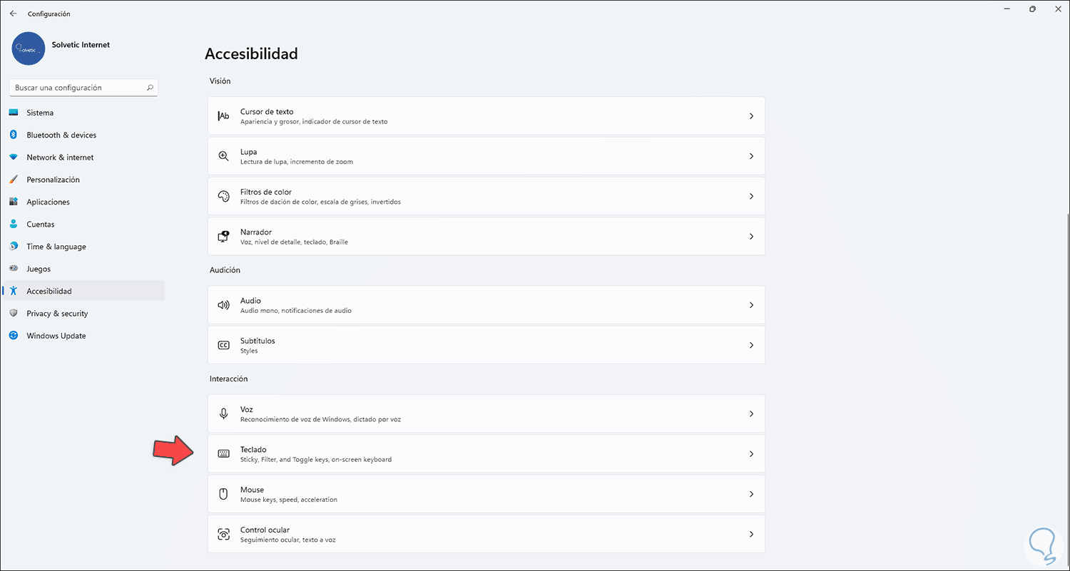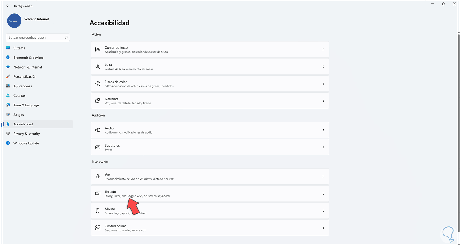En la ventana desplegada vamos a “Accesibilidad – Teclado”: