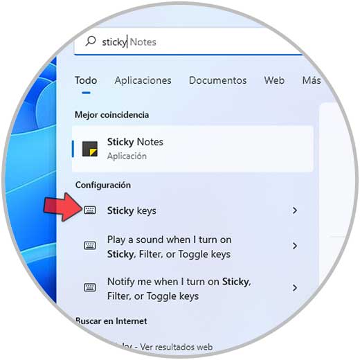 El buscador es otra de las opciones disponibles para este trabajo, en el buscador ingresa "sticky", seleccionamos Sticky Keys: