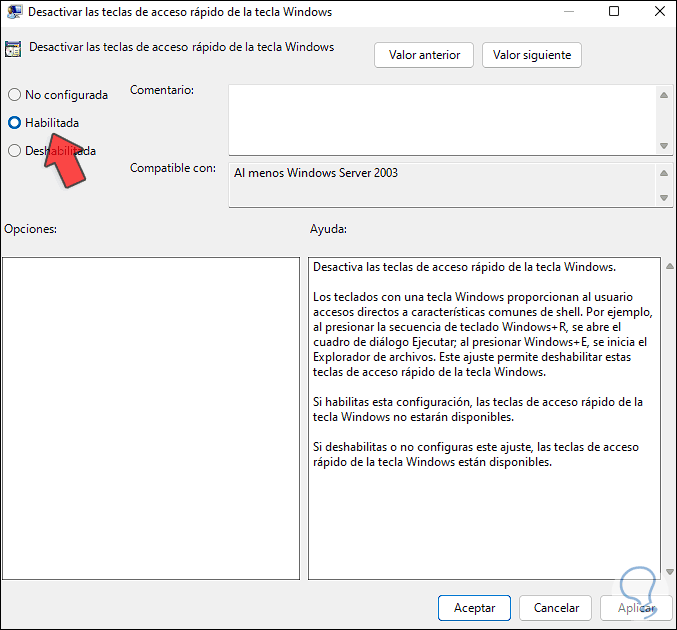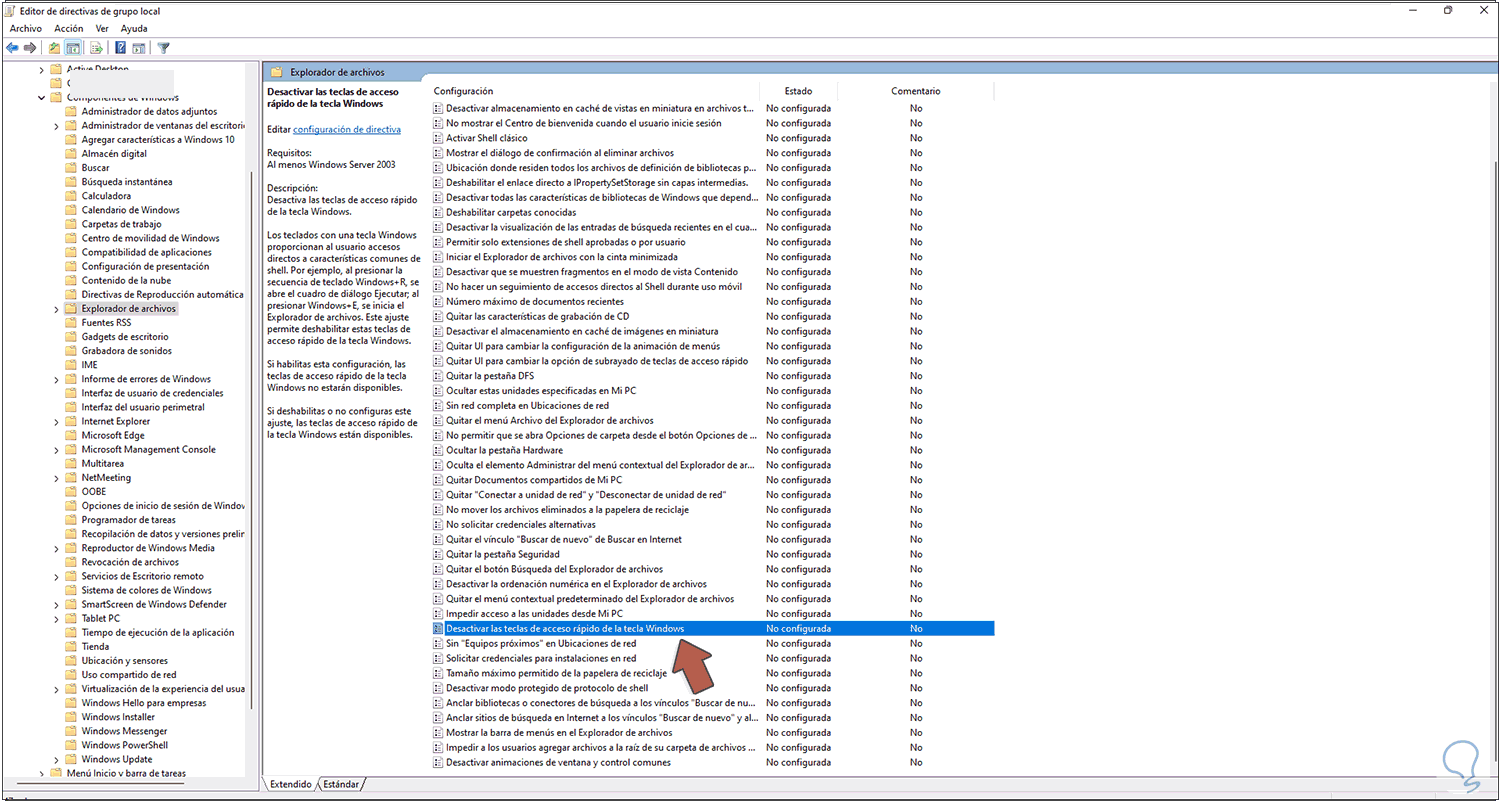 Allí seleccionamos la política "Desactivar las teclas de acceso rápido de la tecla Windows":