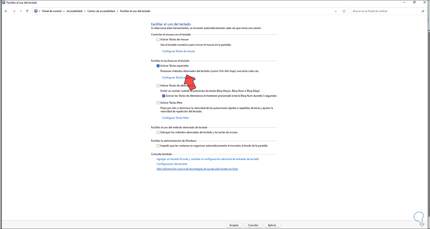 Damos clic en "Facilitar el uso del teclado" y en la siguiente ventana activamos la casilla "Activar Teclas especiales". Aplicamos los cambios.