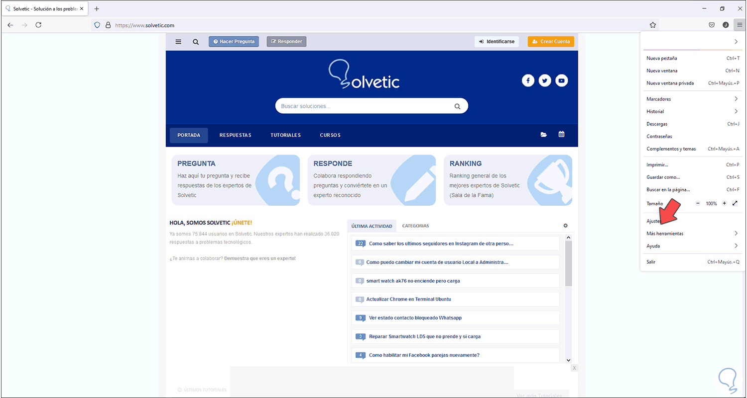 Firefox es otro de los navegadores que cuentan con su propio gestor de contraseñas, en este caso abrimos Firefox y vamos al menú lateral y seleccionamos "Ajustes":