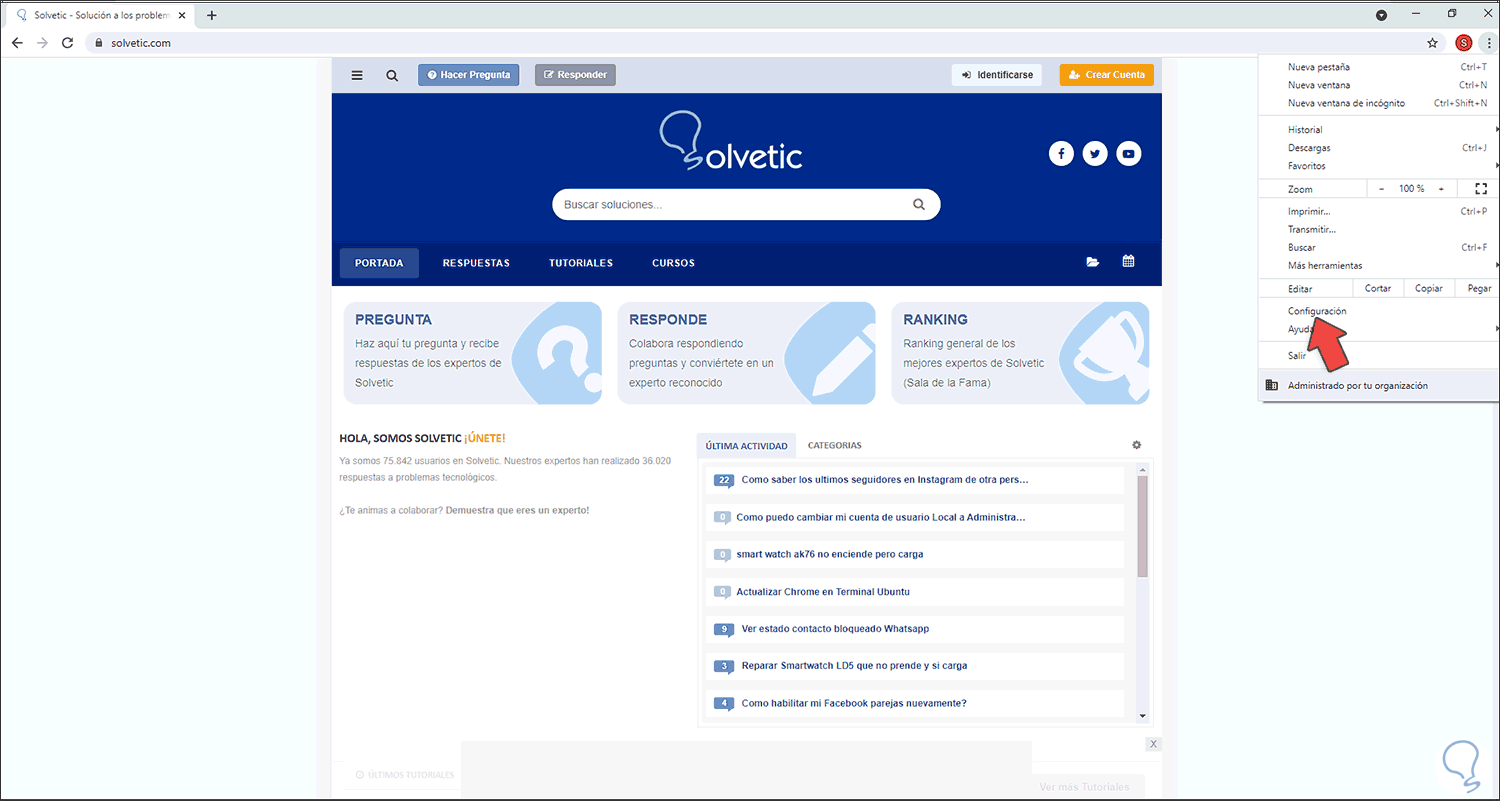 Google Chrome es uno de los navegadores más populares y cuenta con su propio gestor de contraseñas, para su uso abrimos Google Chrome y vamos a la ruta "Personaliza y controla Google Chrome - Configuración":