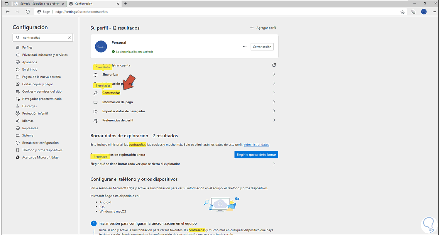 En el campo de búsqueda ingresamos "contraseña" y luego damos clic en "Contraseñas":