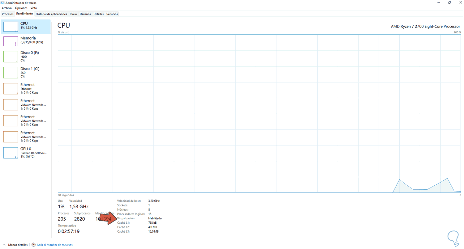 En la pestaña "Rendimiento" seleccionamos "CPU" y en la parte inferior confirmamos el estado en "Virtualización":