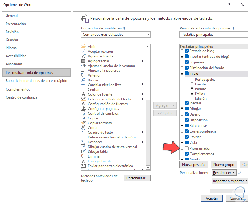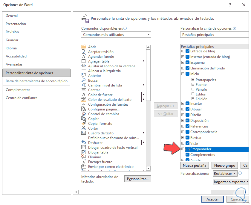 Será desplegada una ventana emergente, en ella vamos a la sección "Personalizar cinta de opciones":