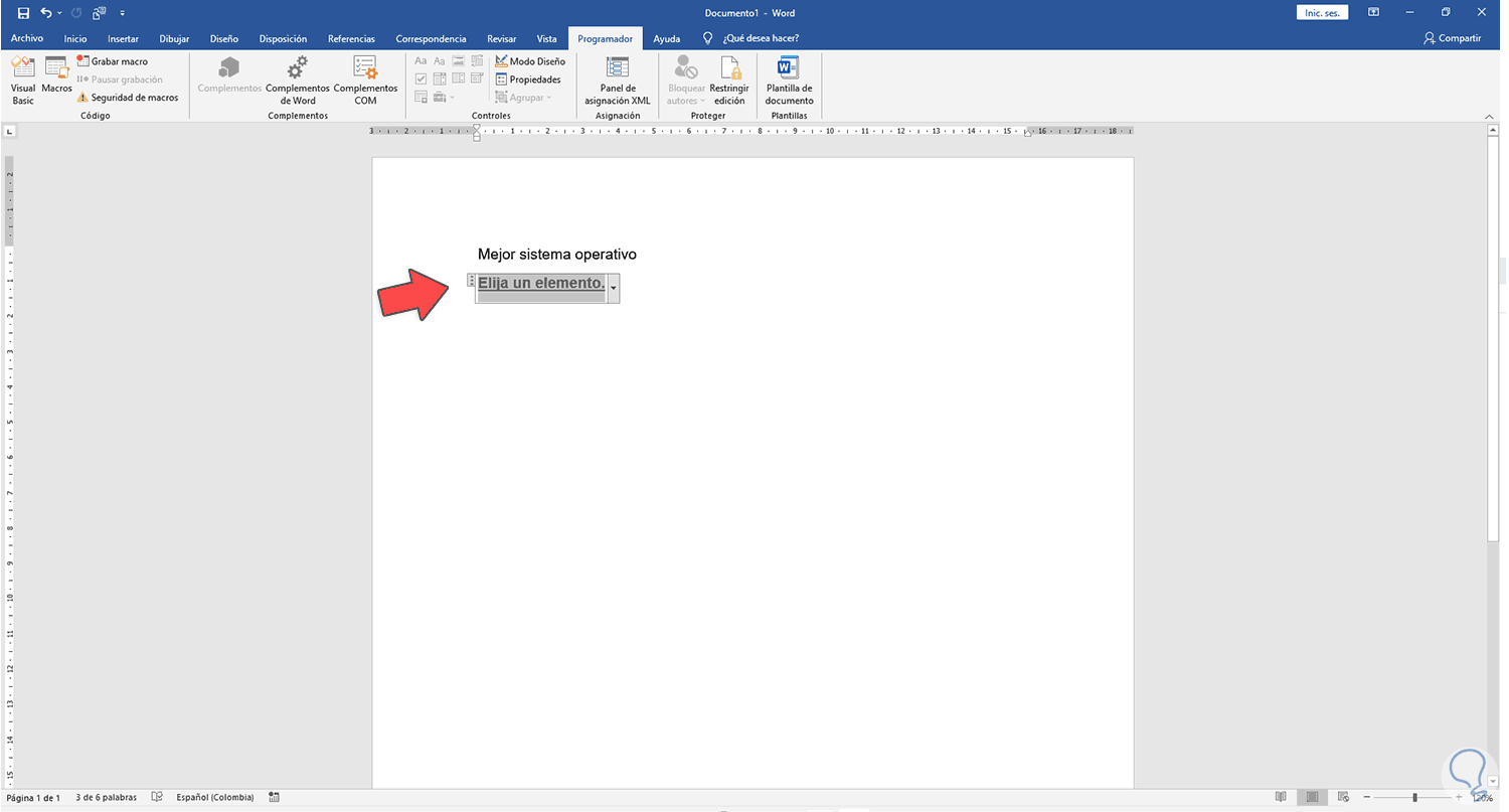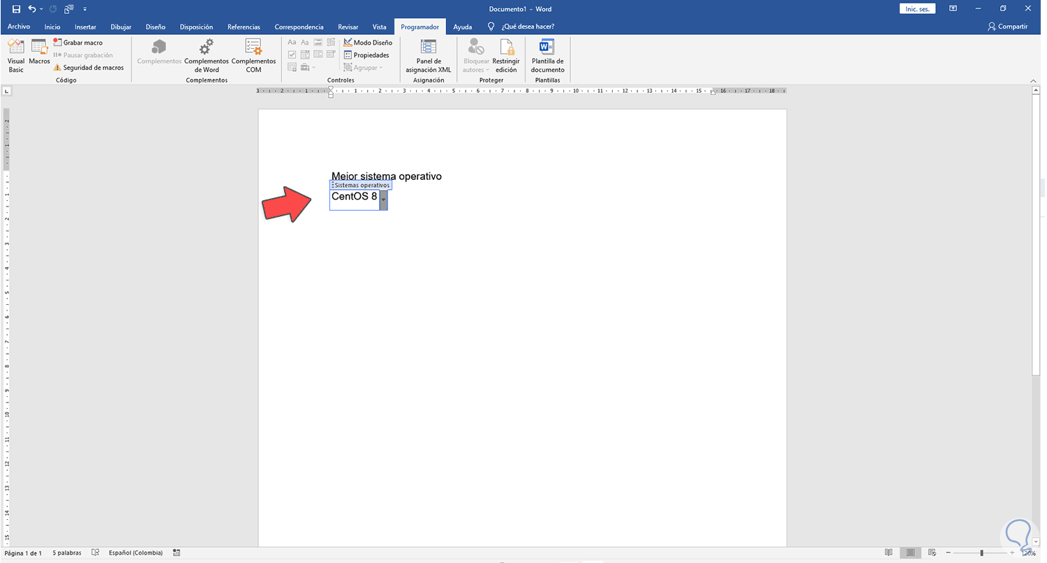 Ubicamos el cursor donde estará la lista, vamos al menú "Programador" y allí, en el grupo Controles, damos clic en "Control de contenido de lista desplegable":
