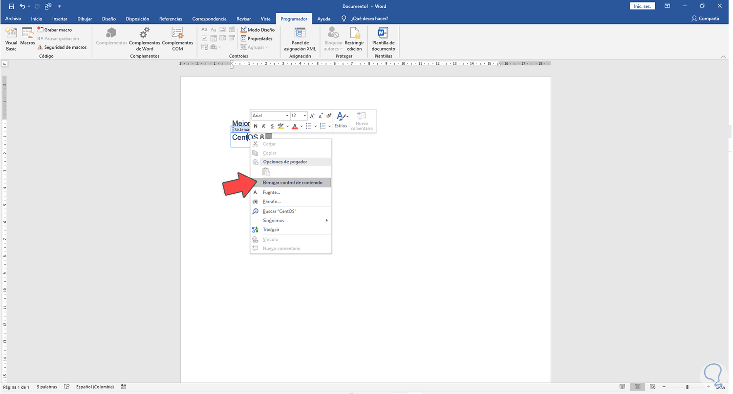 Después de esto damos clic derecho en el cuadro de contenido y seleccionamos la opción "Eliminar control de contenido":