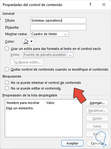 Para borrar el listado, selecciona el cuadro de lista y vamos a "Propiedades", allí desactivamos la casilla "No se puede eliminar el control de contenido". Aplicamos los cambios.